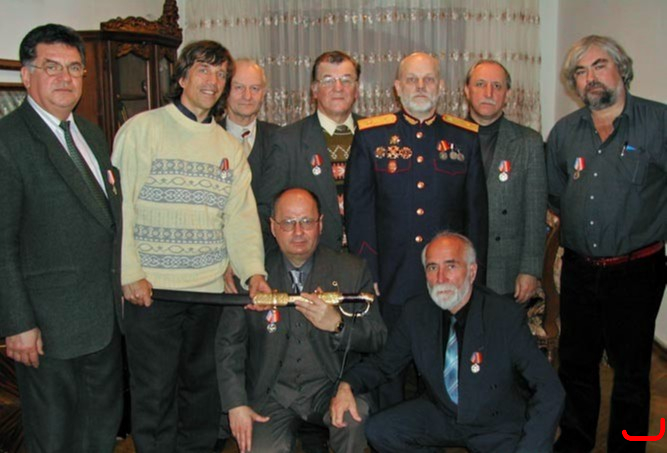 После награждения казачьей медалью "250 лет атаману Платову". С шашкой стоит художник Сергей Бочаров. 2003 г.