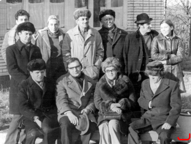 Во время совещания молодых писателей в Софрине (Моск. обл.). Стою второй справа. Рядом – Борис Слуцкий и Булат Окуджава. 1977 г.